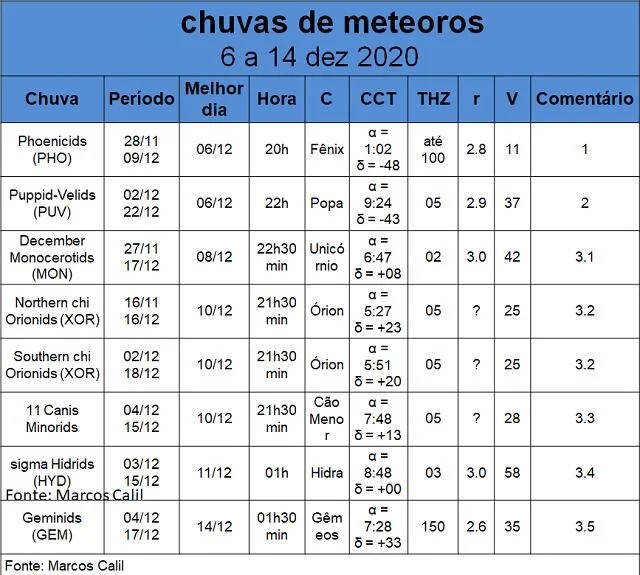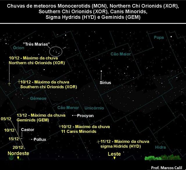 A partir do dia 6 deste mês surgiram no céu, a cada dia, num crescente espetáculo noturno diferentes chuvas de meteoros. São elas: Phoenicidas (na constelação de Fênix), que ficará visível vários dias, se juntando com Pupidías (na constelação de Popa), Monocerotídeas (na constelação do Unicórnio), Orionídias Norte e Sul (na constelação de Órion), Canis Minoridis (na constelação de Cão Menor), Hidrids (na constelação de Hidra) e finalmente a mais esperada Geminidas (na constelação de Gêmeos). Veja na imagem da tabela.
