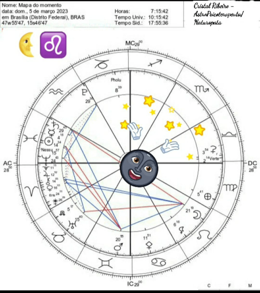 Em 3 de Março, a Lua entrou em Leão. Na primeiro hora do dia 6 de março estará em Virgem, signo onde ocorrerá a Fase Cheia da Lua, no dia 7 às 9h40min.
