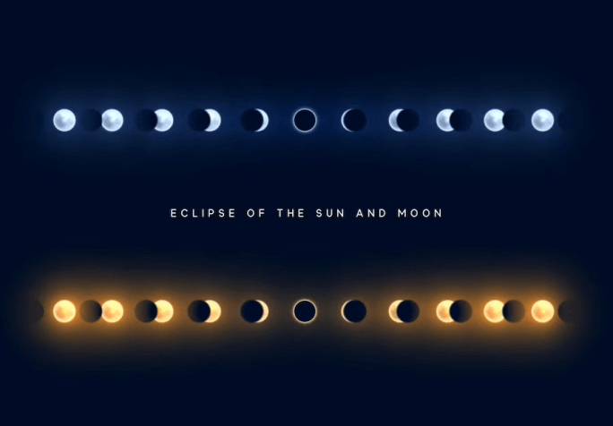 Todo Eclipse Lunar ocorre na Lua Cheia (quando Sol e Lua estão frente a frente – em oposição) e todo Eclipse Solar ocorre na Lua Nova (quando os dois estão alinhados, juntos – em conjunção).