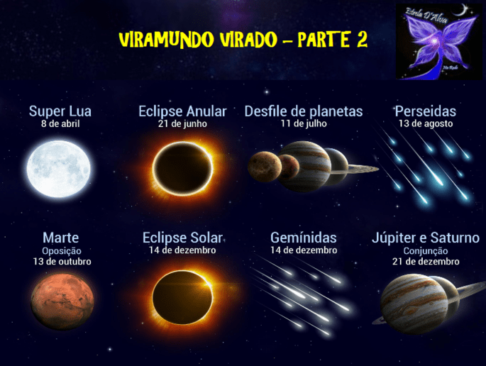 Neste texto apresentaremos os fenômenos, com datas e descrições, para que você possa acompanhar em tempo, observar os que serão visíveis no céu, além de observar como as datas se relacionam e se relacionarão com acontecimentos marcantes de sua vida.