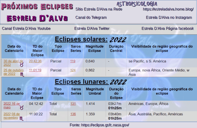 O Ano de 2022 nos dará a oportunidade de vivenciar 4 eclipses especiais. Eclipses no Eixo Touro-Escorpião Por gentileza, visite, curta, siga e inscreva-se: ✫ ˚. - ˚. ★ ✫ ˚.ASTROPSICOLOGIA e afins: Sítio Estrela D'Alva https://estreladalva.home.blog/ Canal do Telegram @EstrelaDalvaPagina Estrela D'Alva Twitter Canal Estrela D'Alva Estrela D'Alva no Instagram NATUROPATIA & Saúde Integral … Continue lendo Tabelas dos eclipses em 2022